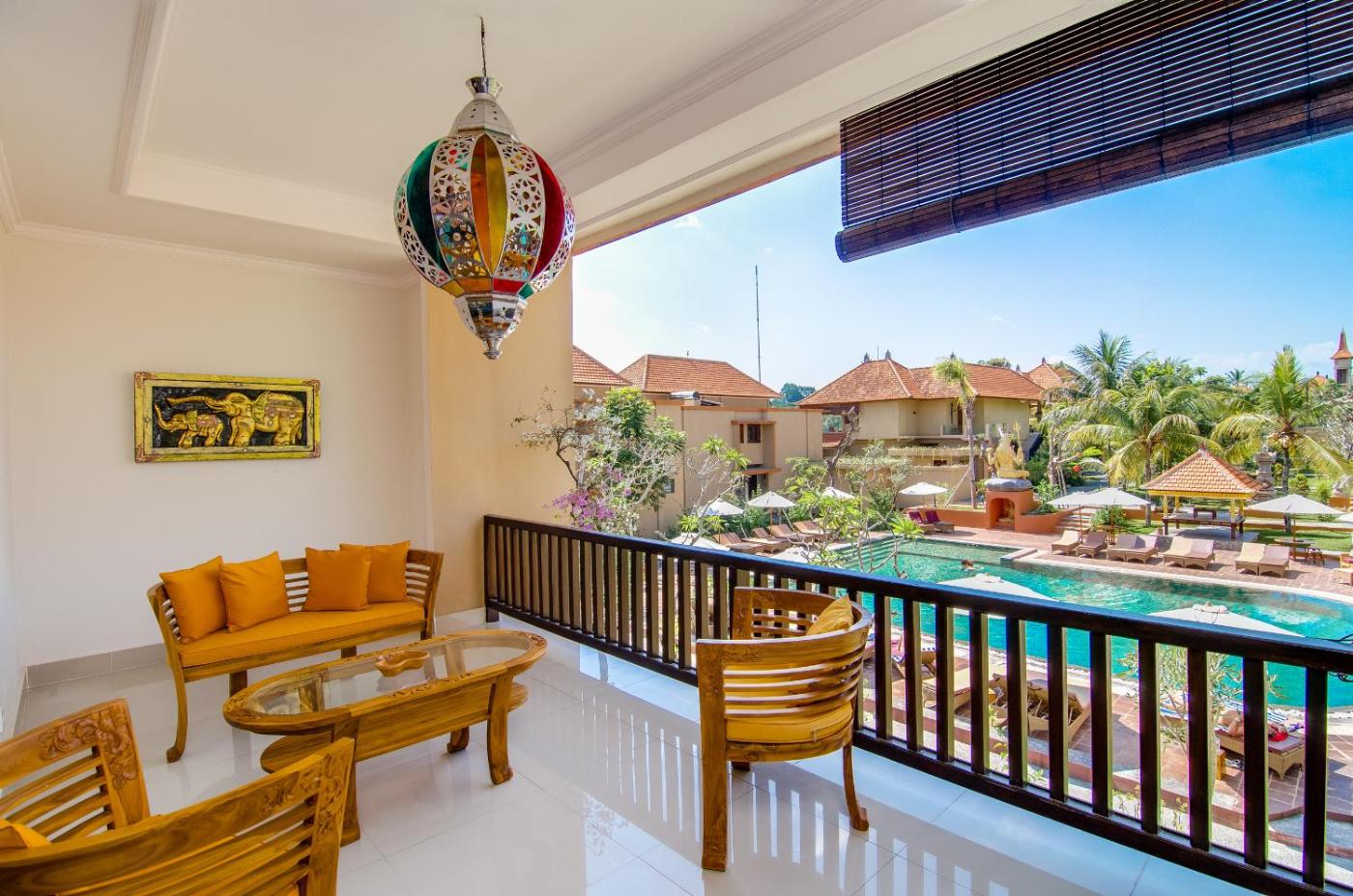Deluxe Room. Featuring unique Balinese style décor, this air conditioned room has a balcony, seating area and en suite bathroom with hairdryer, bathtub and shower. Certain rooms have views of the pool, while others enjoy views of the rice fields. ;